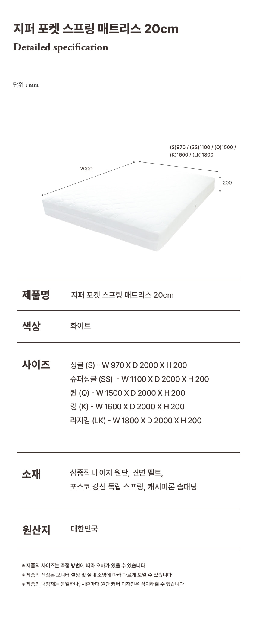 [풀오브빈스] 국내 제작 포켓 스프링 지퍼형 매트리스