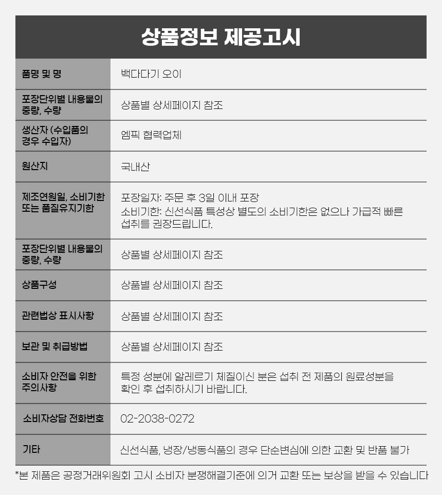 - 신선식품의 경우 재판매가 불가능한 제품 특성상 단순변심 및 개인적 입맛 차이로 인한 반품은 불가능하며 제품 수령 후 문제가 있는 경우 이상부분 사진 촬영하여 수령하신 날짜 기준 2일 이내 연락해주셔야합니다.(기일은 업체별 상이할 수 있으니 수령즉시 연락 부탁드리겠습니다.)