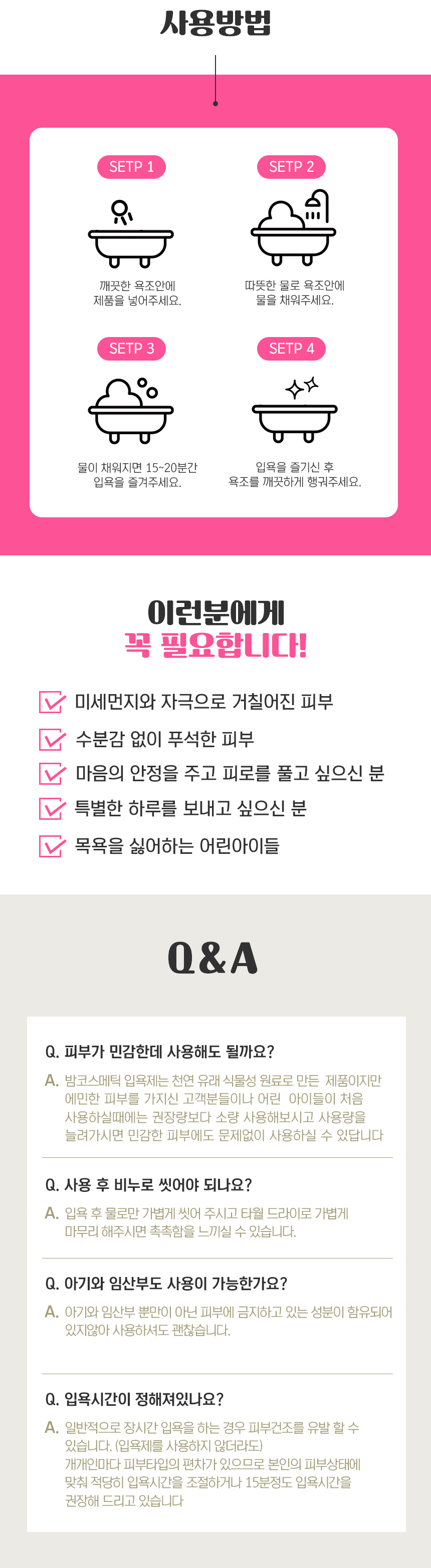 - 욕조에 따뜻한 물을 받아 입욕제를 담그고 15분~20분 입욕 후 깨끗이 씻어냅니다.