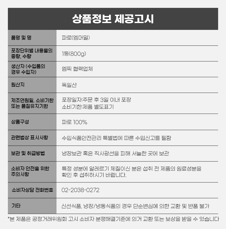 • 신선식품의 경우 재판매가 불가능한 제품 특성상 단순변심 및 개인적 입맛 차이로 인한 반품은 불가능하며 제품 수령 후 문제가 있는 경우 이상부분 사진 촬영하여 수령하신 날짜 기준 2일 이내 연락해주셔야합니다.(기일은 업체별 상이할 수 있으니 수령즉시 연락 부탁드리겠습니다.)
